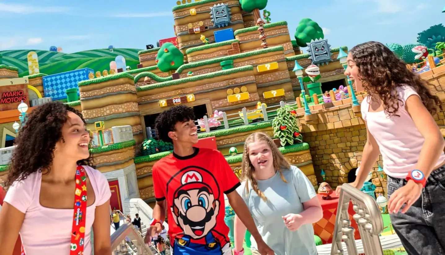 A Super Nintendo World é vibrante e interativa, dividida em Super Mario Land e Donkey Kong Country, com atrações que fazem você se sentir dentro do videogame.