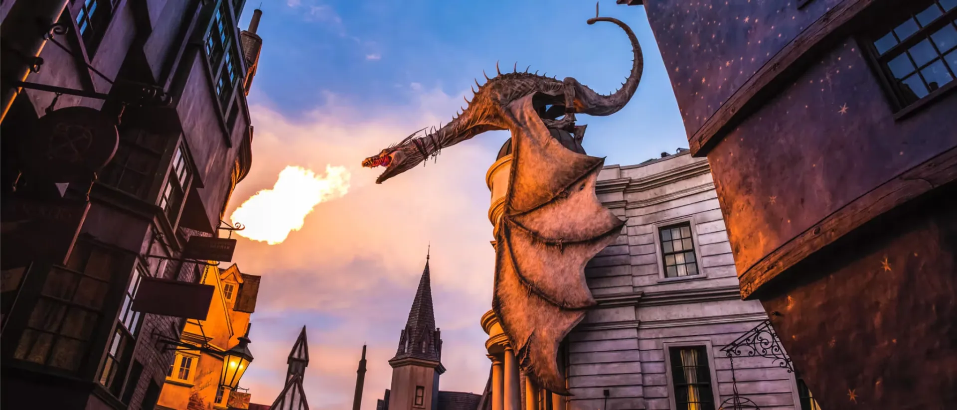 Ao final do Beco, está o imponente Banco Gringotts, com um dragão no topo que cospe fogo periodicamente — um dos momentos mais aguardados pelos visitantes.