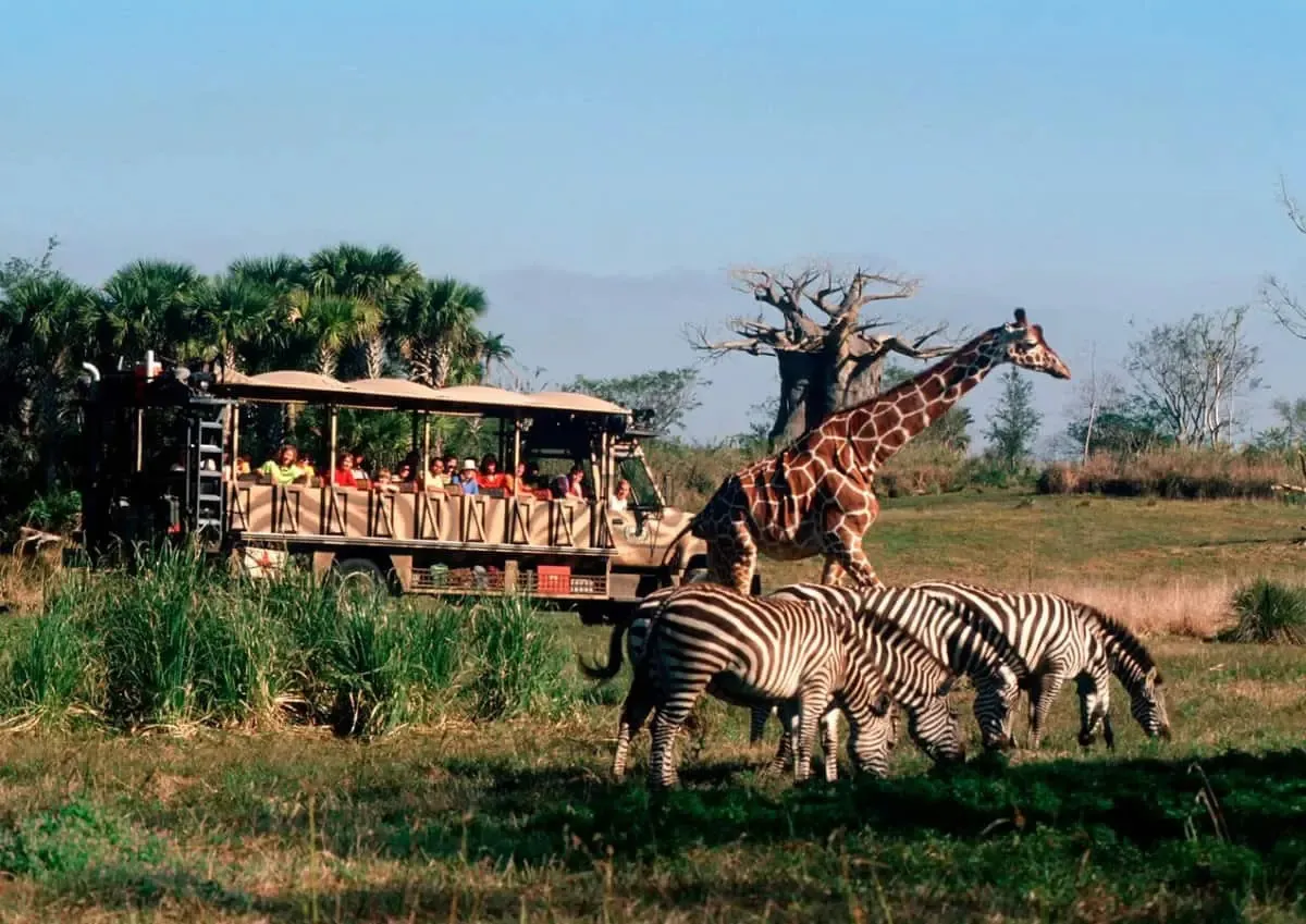 Um dos passeios mais especiais do parque, o Kilimanjaro Safaris permite observar animais de perto em um ambiente que simula a savana africana.